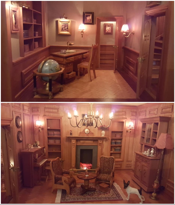 Краснодеревщик тщательно обработал каждую часть замысловатого здания, кроме столовых приборов и чайника, которые ему пришлось заказывать по интернету из одного магазинчика в США. Зачастую поиск крошечных элементов/вещей для создания полноценного интерьера превращалась в забаву для всей семьи, которая старалась проявить смекалку, полностью трансформируя тот или иной предмет в нужный объект.