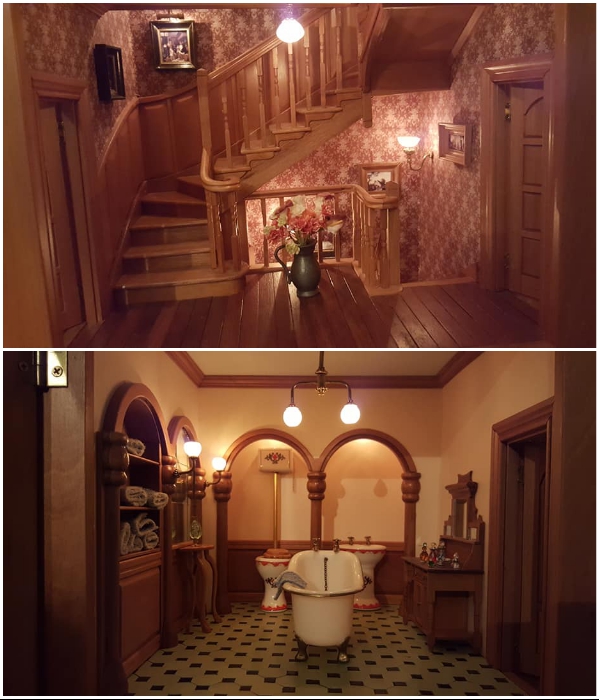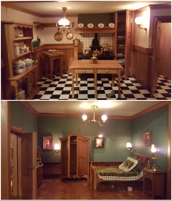 Несмотря на миниатюрные размеры каждый предмет мебели сделан полноценным, а это значит, что двери в шкафах и тумбах без проблем открываются и даже крошечные ящики можно вытащить и задвинуть на место. Включается свет во всех комнатах, льется музыка, а в ванной набирается вода.
