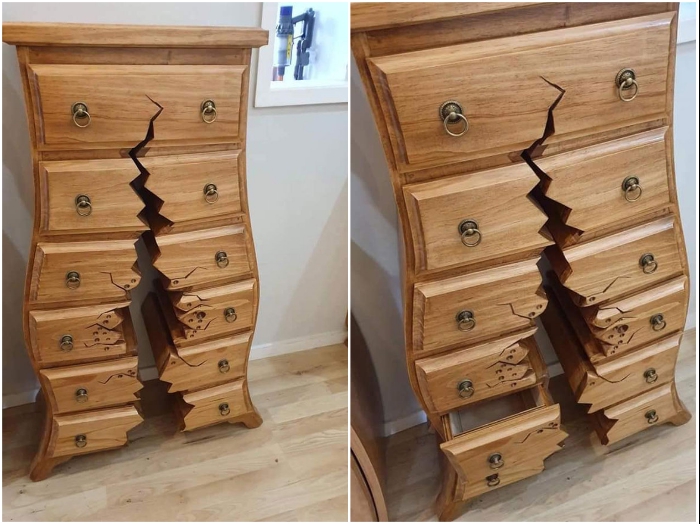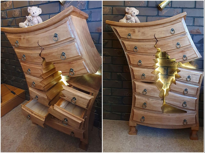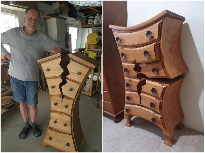 Глядя на его работы, всем без исключения кажется, что это фотоколлаж или обман зрения, ведь не может быть треснутой пополам и искореженной мебели с таким количеством трещин и нереальных деформаций. Но в действительности они разработаны обычным пенсионером-краснодеревщиком и выполнены (вручную!) и вполне даже реальные. А тот факт, что все созданные незаурядным мастером предметы полностью функциональны, делает его творчество еще более особенным.