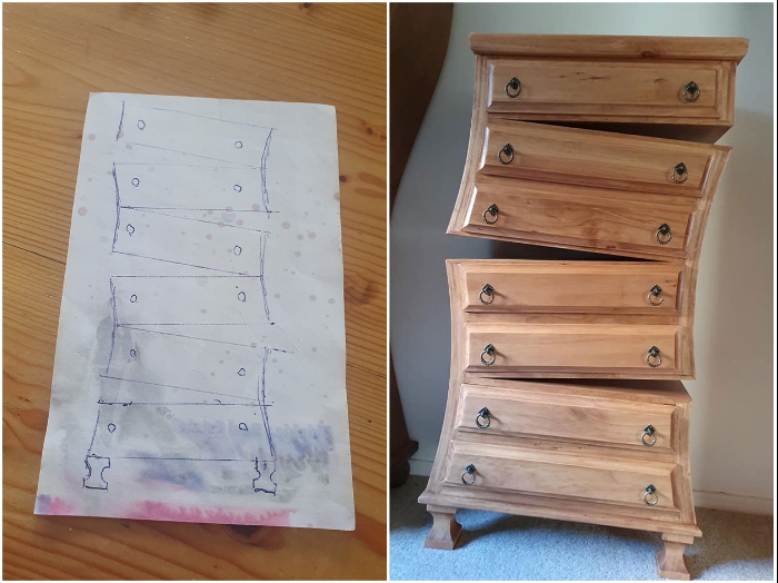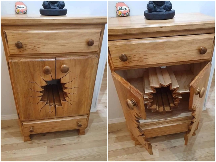 Совсем недавно в Сети появилась уникальная фотоподборка, получившая небывалый резонанс буквально в считанные часы. Дочь талантливого столяра из Новой Зеландии на своей страничке выложила несколько фотографий уникальных работ своего отца. Мультяшные, местами ожившие комоды и полуразрушенные шкафчики настолько поразили и очаровали пользователей, что нет отбоя от желающих купить эти фантастические шедевры. Но креативному пенсионеру пришлось всех потенциальных покупателей пока что огорчить.