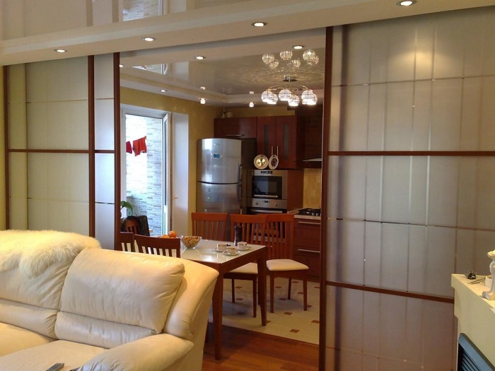Более практичным вариантом зонирования станут раздвижные двери. В закрытом состоянии они полностью изолируют пространство спальни, не только визуально, но и физически отделяя ее от кухни. А в открытом виде двери, наоборот, объединяют пространство дарят дополнительный простор.