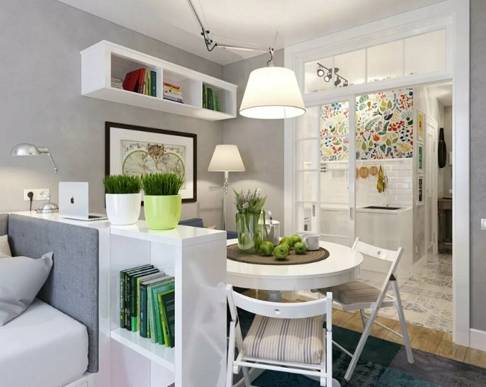 Чтобы сэкономить деньги, зонирование пространства можно осуществить при помощи имеющейся мебели. Например, вы можете развернуть диван спинкой к кухне либо поставить барную стойку. Если комната отличается совсем крохотными габаритами, используйте для зонирования раскладывающийся стол. Его в любое время можно убрать, поэтому особого дискомфорта он не принесет.