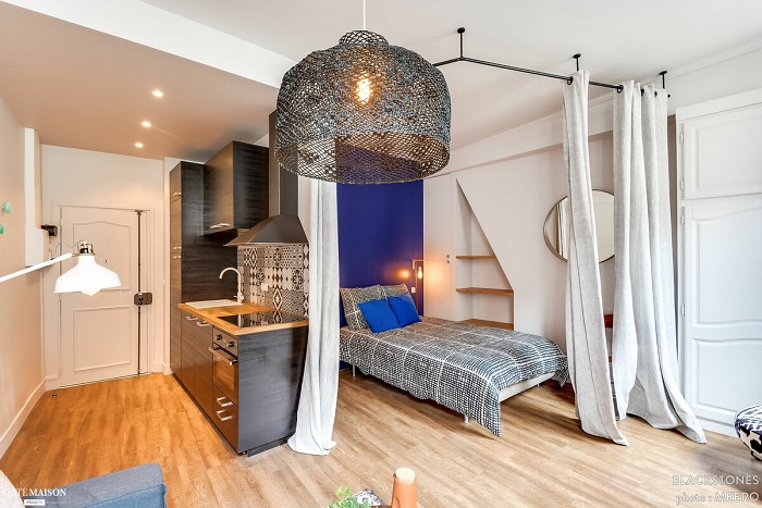 Шторами можно отделить зону для сна от кухни. / Фото: Remontbp.com