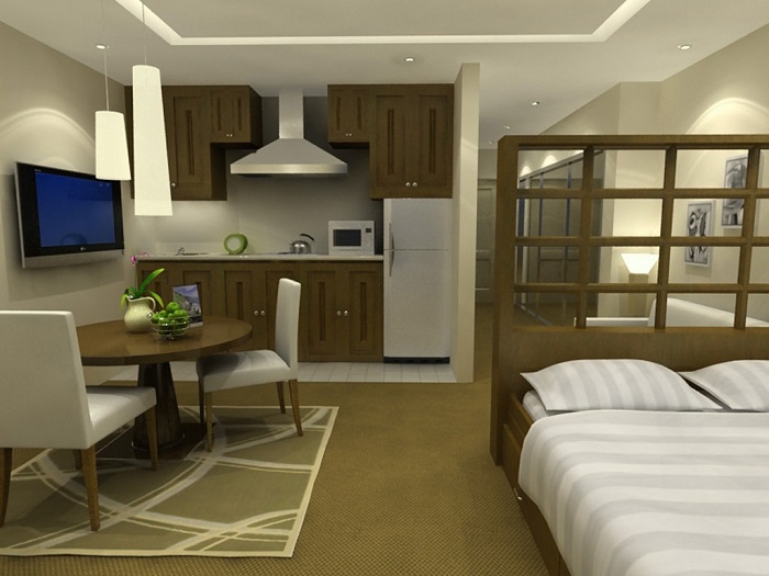4. Бытовая техника, столовая и рабочая зоны обязаны располагаться максимально далеко от спального места. В идеале они должны быть отделены друг от друга перегородкой или любым другим способом зонирования, чтобы у хозяина квартиры было личное пространство.