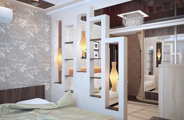 Самым простым и осязаемым вариантом станет разделение комнаты при помощи гипсокартонной перегородки или фальш-стены. Производители часто оснащают их подсветкой, полками, встроенными нишами, чтобы конструкции были максимально функциональными.