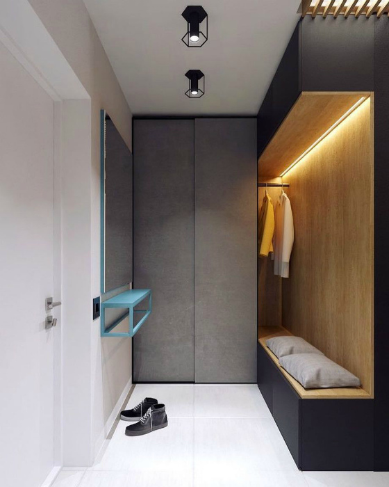 Узкая прихожая с оригинальной мебелью. | Фото: Дизайн Эксперт. Узкая прихожая, которая только благодаря мебели выглядит фантастически. Причем предметов мебели в ней всего три: открытая конструкция со скамьей, крючками для одежды, верхними и нижними шкафчиками, и светодиодной подсветкой, зарытый узкий шкаф серого цвета и узкая голубая полочка.