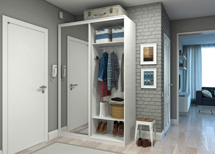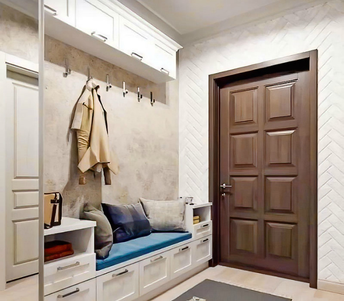 Светлые тона и мелкие детали. | Фото: Так Просто! Несмотря на то, что темные тона кажутся практичнее, в маленькой прихожей лучше остановиться на светлых, хорошо моющихся покрытиях. Также не стоит ограничиваться классическим шкафом. Обратите внимание на полки с выдвижными ящиками, а также на узкие консольные столики.