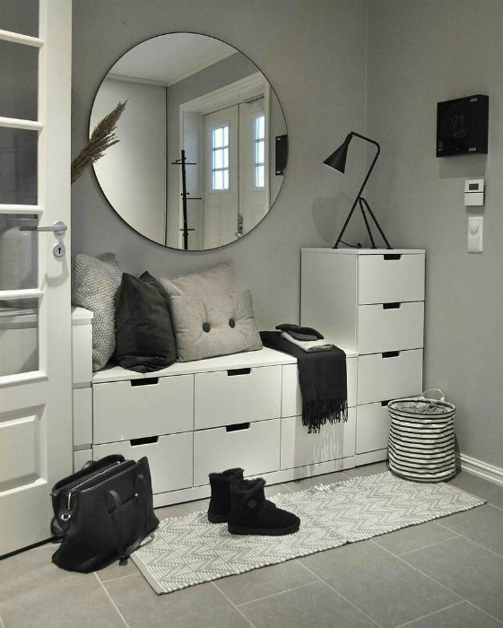 Система ящиков и шкафчиков. | Фото: Pinterest. Невысокий комод со встроенной скамьей и шкафчиками разных уровней, прекрасно впишется в интерьер небольшой прихожей и станет прекрасной альтернативой привычному высокому шкафу.