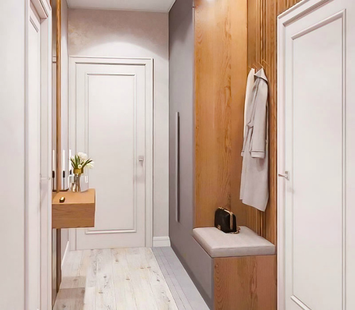 Лаконичный дизайн прихожей. | Фото: Так Просто! По мнению Novate.ru, на фото - пример стильного и лаконичного оформления маленькой прихожей. Светлая отделка в сочетании деревянной мебелью с серыми фасадами выглядит дорого и элегантно.