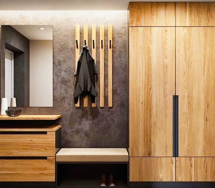 Сочетание разных фактур. | Фото: Pinterest. Небольшая прихожая, в которой удивительным образом удалось сочетать прохладную отделку под мокрый бетон и теплое натуральное дерево. Среди необычных деталей: мебель цвета натурального дерева, дополненная черной фурнитурой, невысокая скамейка с полкой для обуви и вешалка из реек.