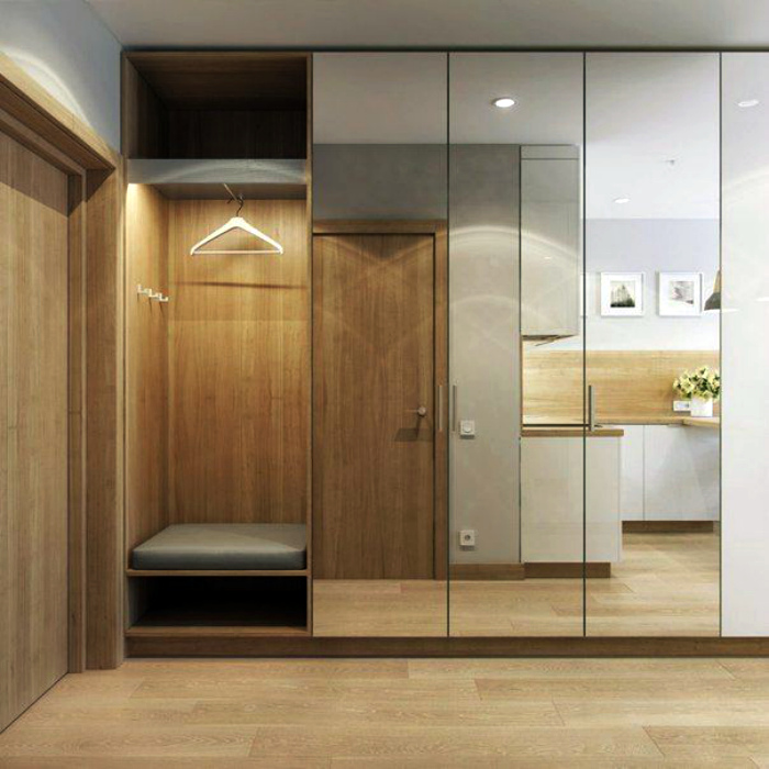Зеркальный шкаф - иллюзия пространства. | Фото: Pinterest. Зеркальный шкаф - всегда отличная идея, если речь идет об узком коридоре. Можно выбрать модель с открытой нишей и встроенной скамейкой. Дополните предмет полоской подсветки и получите готовый законченный интерьер прихожей.
