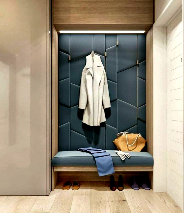 Уютный мягкий уголок. | Фото: Бетон. Главная деталь этой маленькой прихожей стала уютная ниша с мягкой фактурной отделкой, банкеткой, крючками для верхней одежды и подсветкой.
