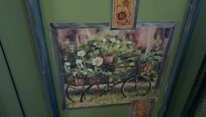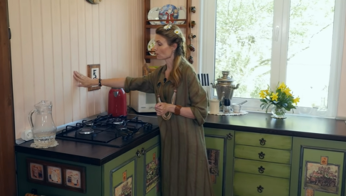 После этого креативная супруга решила привнести нотку прованса и в образовавшиеся «окошки» на фасадах некоторых дверей нанесла оригинальный рисунок, используя знакомую технику декупаж. Конечно же, вся эта кропотливая работа требовала много времени и аккуратности, но декор получился довольно стильный и соответствующий общему стилю оформления кухонной зоны.