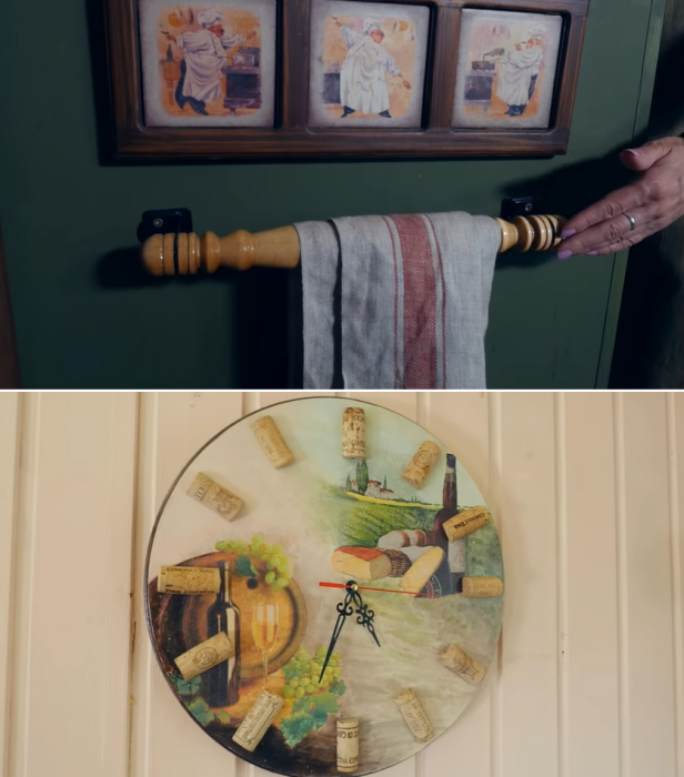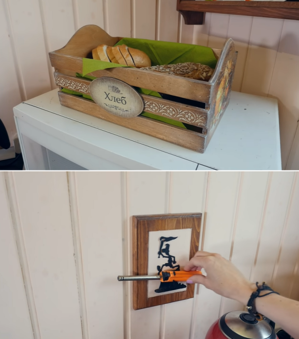 Никаких дополнительных навесных шкафов или конструкций устанавливать не стали, чтобы не загромождать вертикальное пространство, тем более что напольных тумб оказалось вполне достаточно, чтобы спрятать всю кухонную утварь, столовые приборы, крупы, специи и кучу всякой мелочи. Также он своими руками мастер сделал деревянную корзинку для хлеба, которая стала дополнительным украшением интерьера кухни, необычные часы и даже держатель для зажигалки.