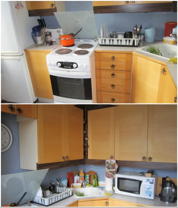 Творческой семье пришлось поломать голову не один день, чтобы все эти несоответствия превратить в плюсы и на выходе получить оригинальную кухню. И начали они с самого простого – решили поднять рабочую зону на удобную для них высоту. Чтобы приподнять немного столешницу, ведь стандартная высота готовых моделей мало кого из современных обывателей устраивает, глава семьи купил мебельные ножки, подпилил их до нужной высоты и закрепил на них все напольные тумбы. Чтобы под установленным гарнитуром не скапливалась пыль и мусор закрыл пролет доской, создав цоколь.