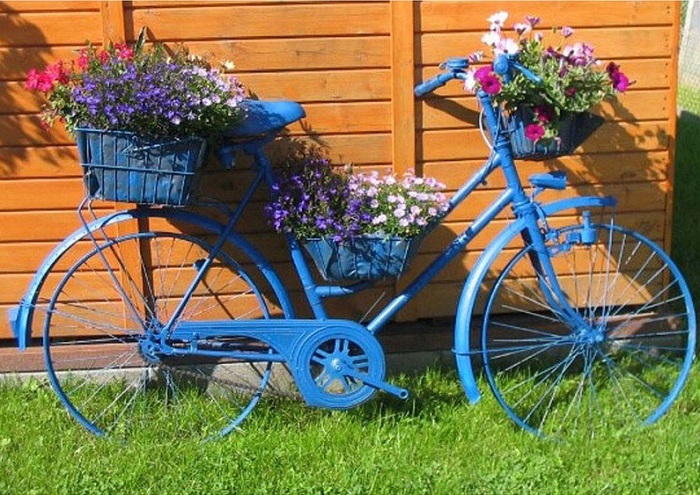 Если у вас есть старый велосипед, который уже нельзя использовать по прямому назначению, не торопитесь выбрасывать его. Большой размер и нестандартная форма не помешают использовать его в качестве декора либо функциональной вещицы. Например, владельцы частных домов или дач могут соорудить из средства передвижения оригинальную клумбу. Для этого нужно обновить внешний вид велосипеда: покрасить его в подходящий цвет, а потом разместить на руле, сиденье и багажнике ящики. Они могут быть деревянными, пластиковыми или плетеными – выбирайте на свой вкус. Затем в емкости нужно насыпать землю и высадить цветы.