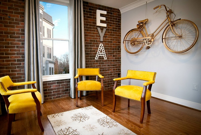 Еще один оригинальный вариант использования велосипеда – настенный декор. Просто помойте или покрасьте транспортное средство, а затем повесьте на стену в гостиной. Однако помните, что подобный декоративный элемент впишется далеко не в каждый интерьер. Велосипед красиво будет смотреться в квартире в стиле лофт, а вот классика его не приемлет.