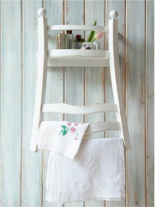 Существует много статей на тему того, что в квартире нужно регулярно проводить ревизию и выбрасывать старые вещи. Особенно это касается мебели и прочих габаритных предметов, которые лишь занимают драгоценное место в квартире. Однако те же стулья можно сохранить и превратить в оригинальные полки, которые гармонично впишутся в имеющийся интерьер. Все, что вам нужно сделать – распилить их пополам, покрасить в подходящий цвет и закрепить на стене. В результате сидение станет отличным местом для хранения книг, фотографий и прочих предметов, а спинку и ножки можно будет использовать в качестве крючков для одежды и сумок.