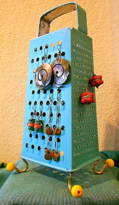 Многие девушки часто сталкиваются с проблемой удобного хранения украшений. Зачастую для этих целей используются шкатулки, однако в них бижутерия часто путается и потом сложно достать нужную сережку или браслет, так как украшения превращаются в один сплошной ком. Чтобы избежать таких последствий, вместо шкатулки используйте обычную кухонную терку. Удивлены? Оказывается, этот девайс вполне может выполнять не только свою основную функцию. Покрасьте терку в яркий красивый цвет, соорудите оригинальные ножки из бусин, и поставьте на туалетный столик. Таким образом она еще и послужит украшением интерьера.