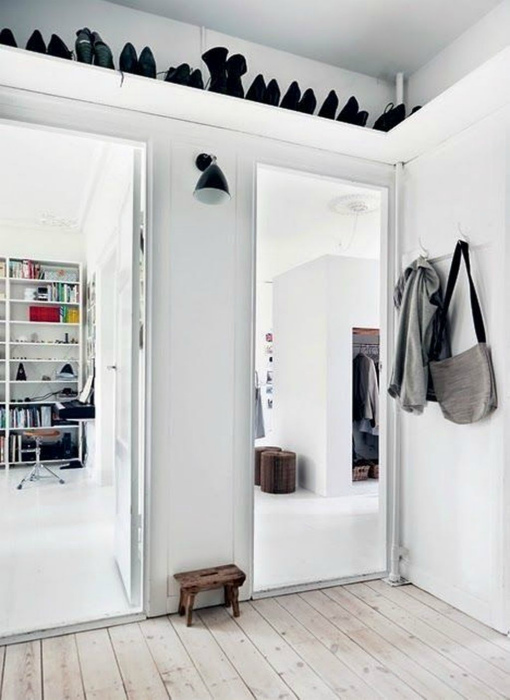 Широкая полка над дверью. | Фото: NaiBann. Пространство над дверью в 70 процентах квартир пустует. Однако, это место можно использовать для сооружения широкой полки. В дальнейшем на ней можно будет хранить обувь или сезонную одежду. Только перед тем, как заполнять полку, позаботьтесь о контейнерах для хранения, иначе вся одежда в скором времени покроется пылью.