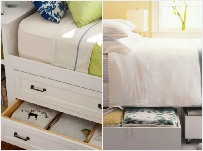Хранение под кроватью. | Фото: Фотографии красивых интерьеров, Pinterest.ru. Заказывая кровать с выдвижными ящиками, вы убиваете сразу двух зайцев. Во-первых, это вместительная система хранения для сезонной одежды, постельного белья и полотенец, во-вторых, защита от пыли.
