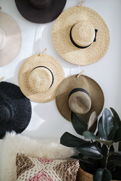 Хранение шляп и кепок. | Фото: Pinterest. Шляпы и кепки достаточно объемные и могут занимать целую полку в шкафу. Это место можно приспособить под хранение других вещей, а головные уборы красиво развесить на стене при помощи обычных прищепок. Закрепить прищепки можно с помощью двустороннего скотча, но лучше использовать клей. Только, если выбираете второй вариант, стоит тщательно просчитать размещение шляпок, чтобы они выглядели эстетично и гармонично смотрелись на стене.