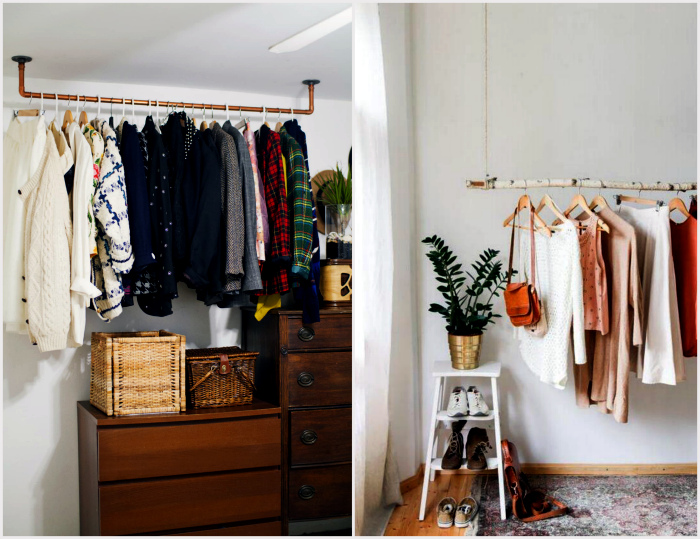 Оригинальные подвесные рейлинги. | Фото: ITW01, Apartment Therapy. Гардероб открытого типа - стильная альтернатива обычному шкафу. Все что нужно для его создания - подходящая перекладина и крепежная система. По мнению Novate.ru, подобная система хранения прекрасно подойдет для размещения платьев, пиджаков и брюк на вешалках.