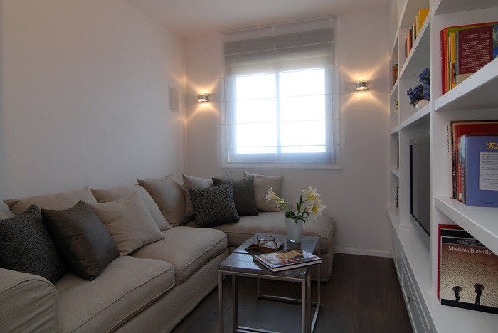 Существует одно негласное правило – в маленькой комнате не должна присутствовать крупная массивная мебель. Огромная кровать, диваны с парой кресел в комплекте, шкаф на всю стену, большой журнальный столик, об который вечно все спотыкаются. Эти предметы мебели являются настоящим табу для крохотных помещений. Они занимают все свободное пространство, не оставляют места для маневров. Многие оправдывают такой интерьер тем, что в квартире должно присутствовать достаточное количество систем хранения, а если она не отличается большими габаритами, то совсем неудивительно, что вся площадь оказывается заставленной мебелью. Однако есть альтернативы. Например, вместо двуспальной кровати можно поставить раскладной диван, вместо массивного прямоугольного стола – круглый или откидной, вместо большого шкафа – два узких и высоких экземпляра в тон стен, чтобы они сливались с интерьером. Помните о том, что в комнате должно оставаться больше свободного места, чтобы вы могли себя там комфортно чувствовать и нормально передвигаться.