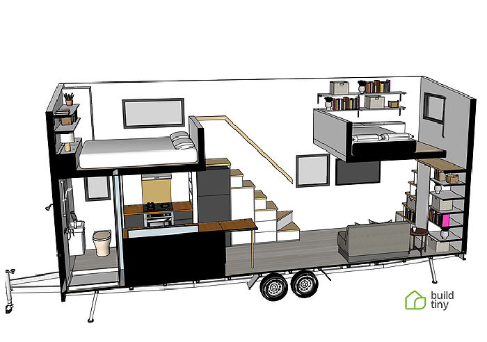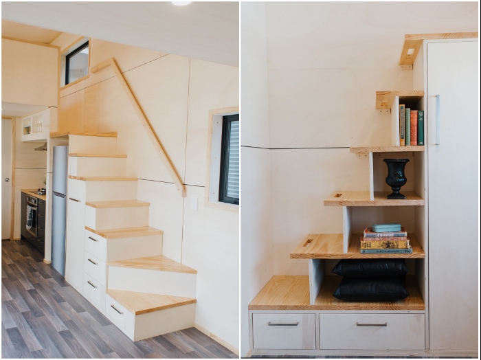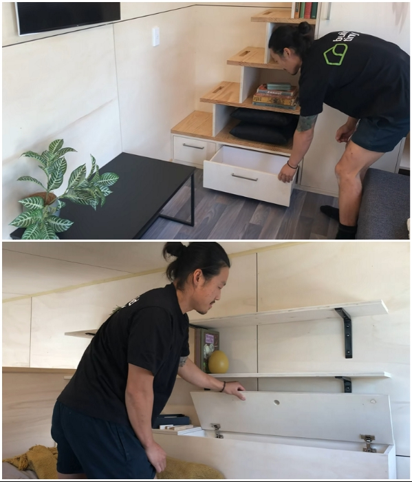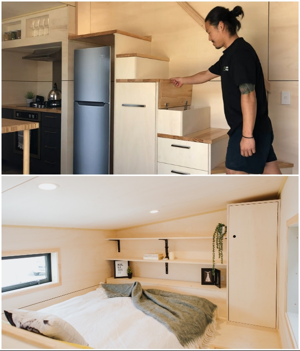 По их чертежам в «Home Haven» были сделаны не только спальные зоны и многофункциональные лестницы, но и кухонный гарнитур со встроенной раковиной, духовым шкафом, трехконфорочной плитой, работающей на пропане, вместительные тумбы для кухонной утвари и навесные шкафчики для хранения продуктов питания.