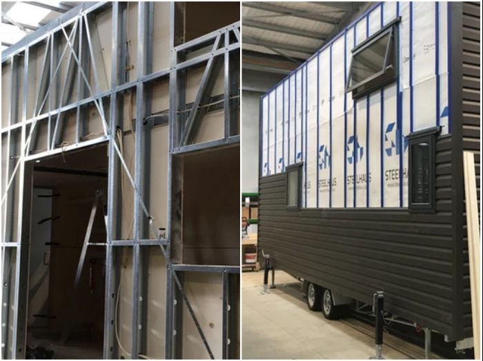 Чтобы домик на колесах «Home Haven» был универсальным, стены изначально утеплили и шумоизолировали, после чего обшили виниловыми панелями, которые позволяют минимизировать количество стыков при облицовке фасада. А это значит, что увеличивается тепло- и гидроизоляция, тем самым продлевается жизнь материалам, расположенным внутри конструкции. Также для усиления защиты от погодных условий установили металлопластиковые окна с двойным остеклением и защитной энергоэффективной пленкой. На этом использование искусственных материалов практически закончилось.