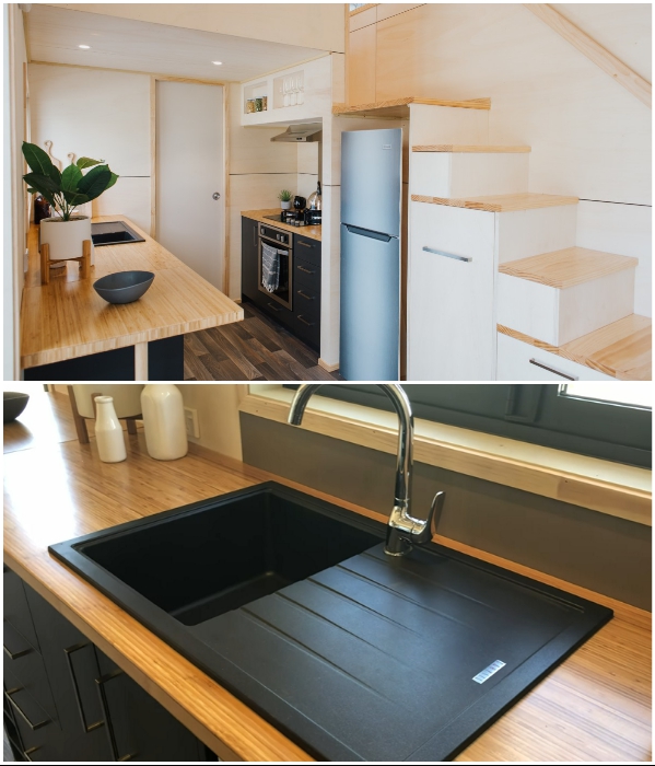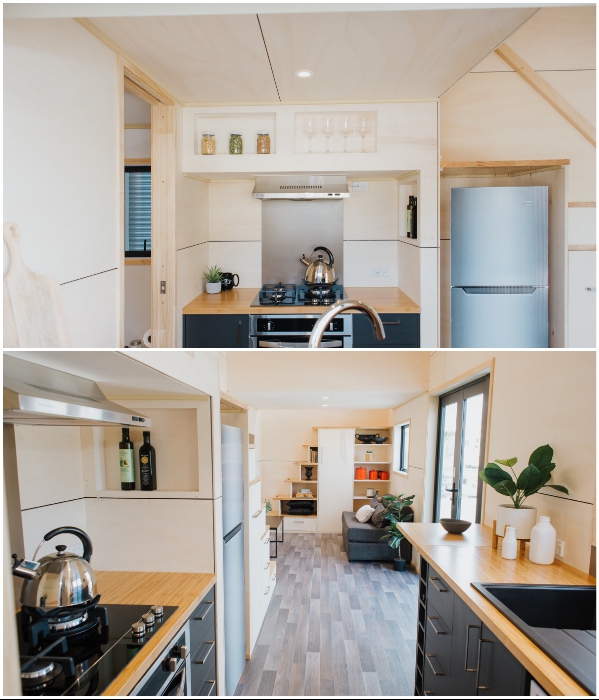 В мини-резиденции «Home Haven» на колесах поместилась укомплектованная современной техникой и мебелью кухня (Новая Зеландия). | Фото: newatlas.com.