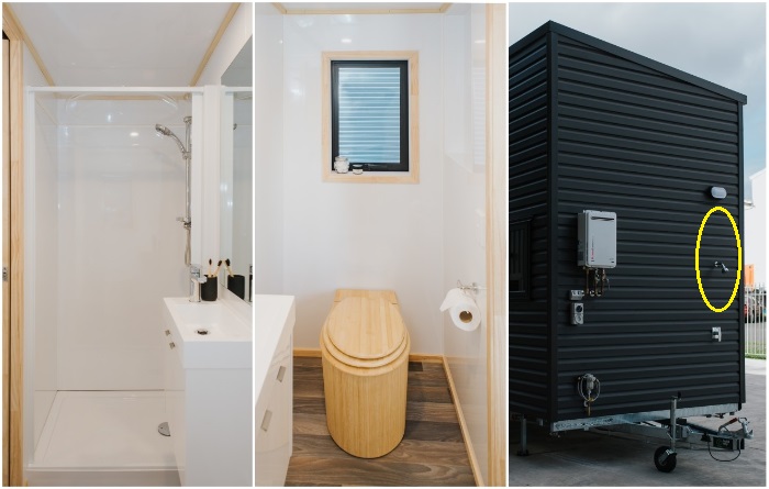 Сразу же за кухонно-столовой зоной находится ванная комната с санузлом, к которой ведет раздвижная дверь. Несмотря на миниатюрные габариты, она выглядит очень даже уютно, здесь установили душ, раковину и туалет с функцией компостирования. Также на фасаде домика предусмотрено крепление и подводка воды для навесного уличного душа, так что в теплую погоду можно будет принимать водные процедуры просто на улице.
