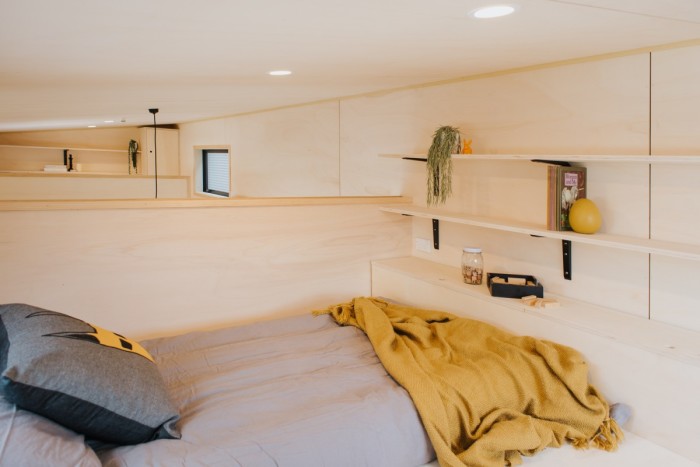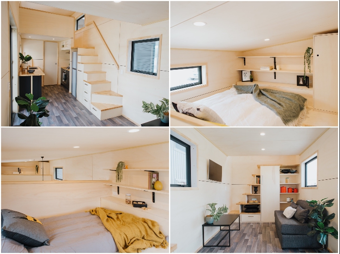 Внутри крошечного дома вся отделка была сделана лишь с экологически чистых натуральных стройматериалов с минимальным использованием лако-красочных средств. Поскольку заказчик пожелал, чтобы его мобильный дом был сдан «под ключ», то команда разработчиков рассчитала каждый миллиметр внутреннего пространства.