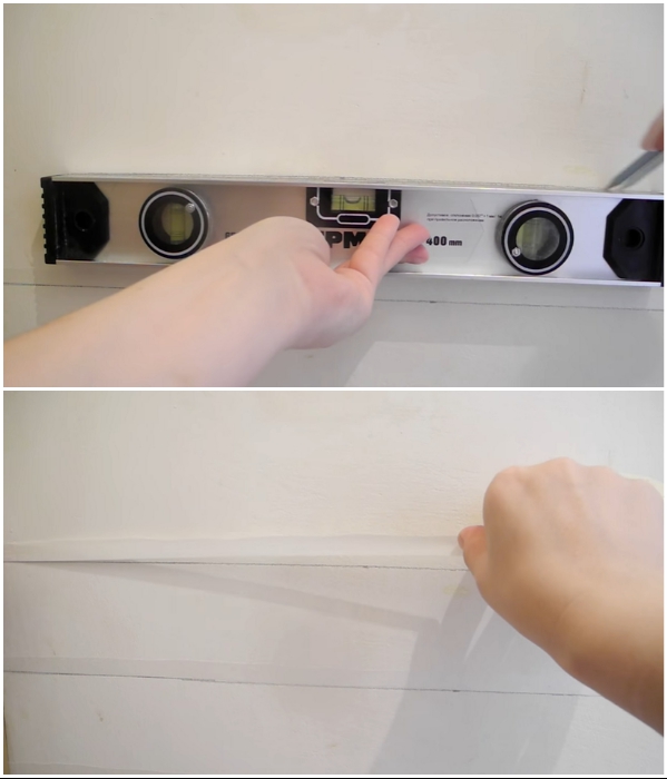 Если в время снятия скотча нарушается целостность края или получаются острые края, их сразу же нужно сглаживать смоченной в воде поролоновой губкой. После того, как вся поверхность будет сделана, ей дается достаточно времени для полного высыхания. Если все-таки на вновь созданной декоративной стене остались острые выступы или края, то нужно пройтись мелкозернистой наждачной бумагой, чтобы избежать неприятных ситуаций в дальнейшем. Только после этого можно приступать к покраске стены.