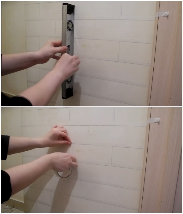 Чтобы сделать кладку, имитируя натуральный кирпич, нужно подготовить стену, если есть трещины, их непременно стоит освободить от отошедшего покрытия, очистить от пыли и сделать разметку. Ширину и высоту создаваемых кирпичей каждый определяет сам в зависимости от размера самой стены. Единственное, что такие манипуляции нужно проводить с помощью уровня, на глаз правильную и аккуратную разметку сделать не получится. После того, как вся разметка сделана можно ее заклеивать полосками малярной ленты.