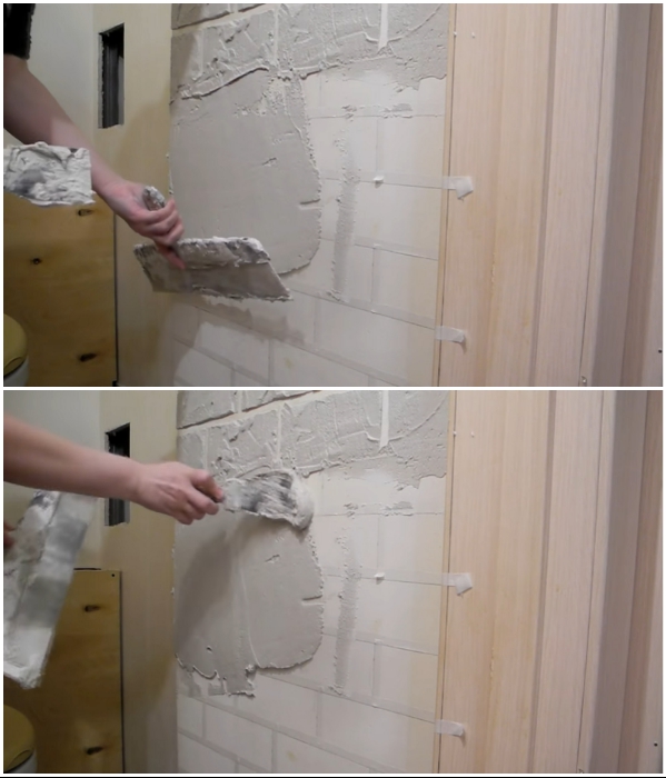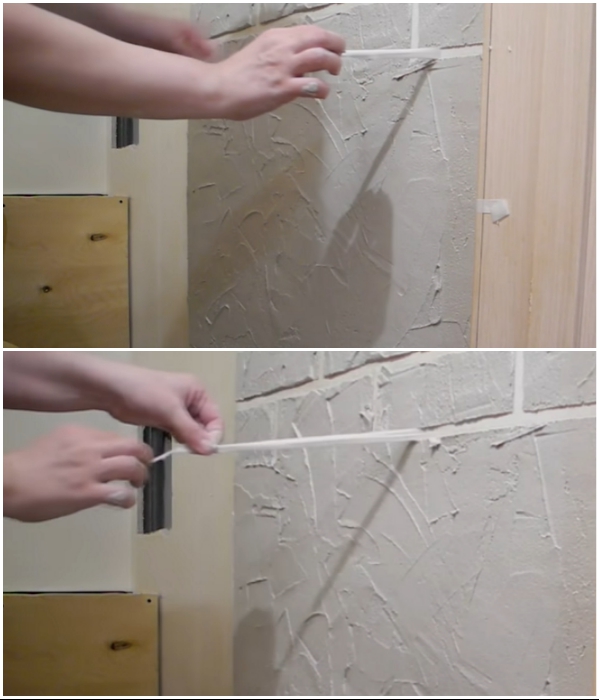 Когда закончили создавать сетку можно, приступать к нанесению финишной шпаклевки. Если таким творчеством занимается дилетант, то наносить раствор нужно частями, потому что снимать малярную ленту надо до того, как верхний слой застыл. В противном случае будут большие проблемы и кирпич не получится. При этом не стоит забывать, что кирпич гладким не бывает и с помощью небольшого шпателя нужно дополнительно придать «натуральность» и фактурность (это делается до снятия ленты).