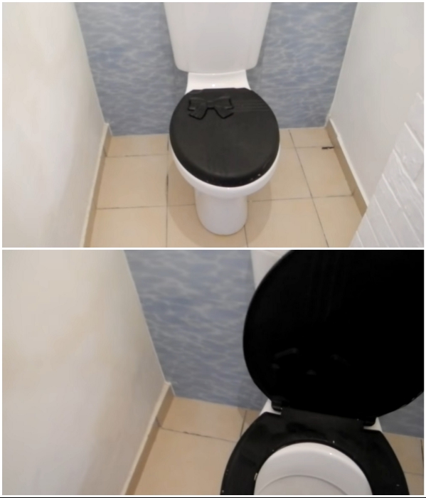 После того, как дизайн помещения поменялся, крышка на унитазе никак не вписывалась в общую картинку, и что бы не покупать новую, рукодельница решила ее покрасить. К счастью, черная акриловая краска в баллончике была в наличии.