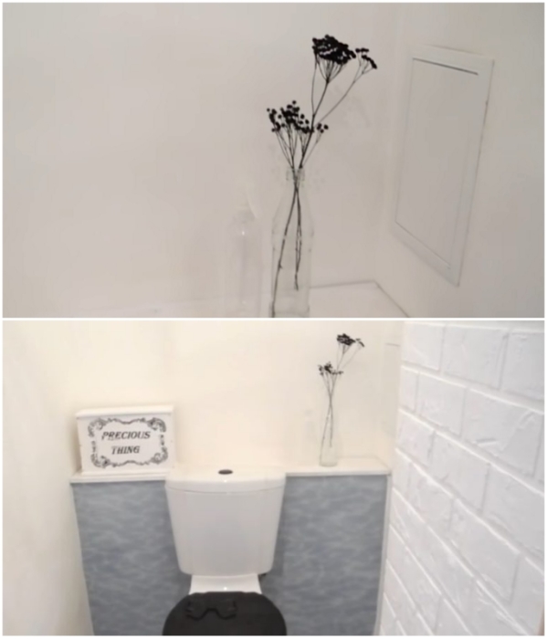 Даже когда небольшой ящик занял свое место на полочке, образованной в следствии создания экрана, спрятавшего коммуникации, не хватало последнего штриха. Поразмыслив, Екатерина поискала в своих запасах обычную стеклянную бутылку, насобирала сухих растений и веточек, покрасила их в черный цвет и поставила эту необычную композицию на полочку, с другой стороны. Только после этого неугомонная дама успокоилась и закончила свой ремонт. Когда все закончилась женщина подвела итог и поняла, что свой ремонт она сделала практически из строительных отходов, которые отправились бы в мусорку. На весь процесс обновления хозяйка потратила всего лишь 460 руб. и то, потому что у нее не оказалось полотна для электролобзика, гофры для унитаза и не хватило черной краски. Силиконовый герметик, интерьерная краска и разные полезные мелочи и детали оказались у нее дома.