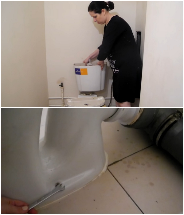 Главной задачей при новом обустройстве было создание экрана, который бы закрывал ненавистные коммуникации, портящие весь вид. Но после замеров оказалось, что унитаз стоит настолько близко к трубам, что ничего установить было невозможно. Тогда отважная женщина решила его самостоятельно ...выдвинуть на 8 см. вперед. На такие преобразования мало кто из мужчин решается, а тут полный дилетант в этом деле принимается за работу. Как оказалось, это не такой уж и сложный процесс; для начала нужно перекрыть воду, слить остаток с бачка. Поскольку это была модель компактного унитаза, оставалось лишь снять шланг подачи воды, открутить 2 болта и пол дела было сделано. Но когда оставалось избавиться лишь от напольного крепежа, оказалось, что болты заржавели и Екатерине пришлось потратить 3 часа, чтобы от них все-таки избавиться. Совет от авторов Novate.Ru: Если при визуальном осмотре окажется, что болты, которые держат бачок (при настенном крепеже) или сам унитаз, заржавели, не стоит пытаться их выкручивать, а лучше сразу срезать ножовкой по металлу. Герметик же, которым заливается соединение с полом можно, подрезать острым лезвием или канцелярским ножом.