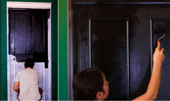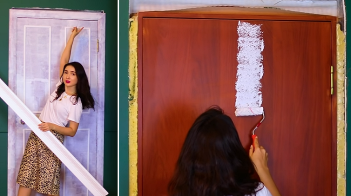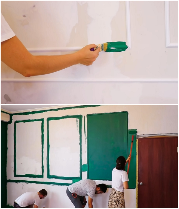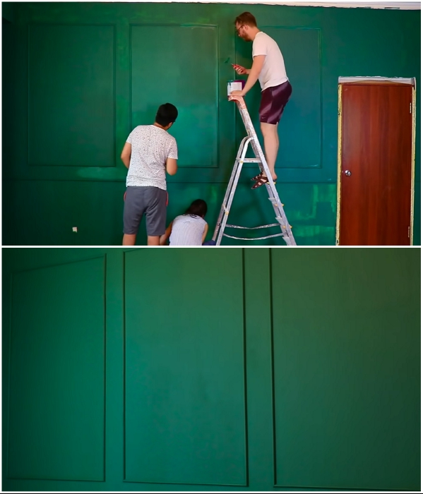 Чтобы «связать» акцентную стену и плоскость двери, на нее тоже наклеили молдинги, используя тот же принцип, что и вначале процесса. После этого смело можно наносить в несколько слоев краску. И в этом случае была выбрана матовая краска, которая смотрится более благородно, нежели глянец.