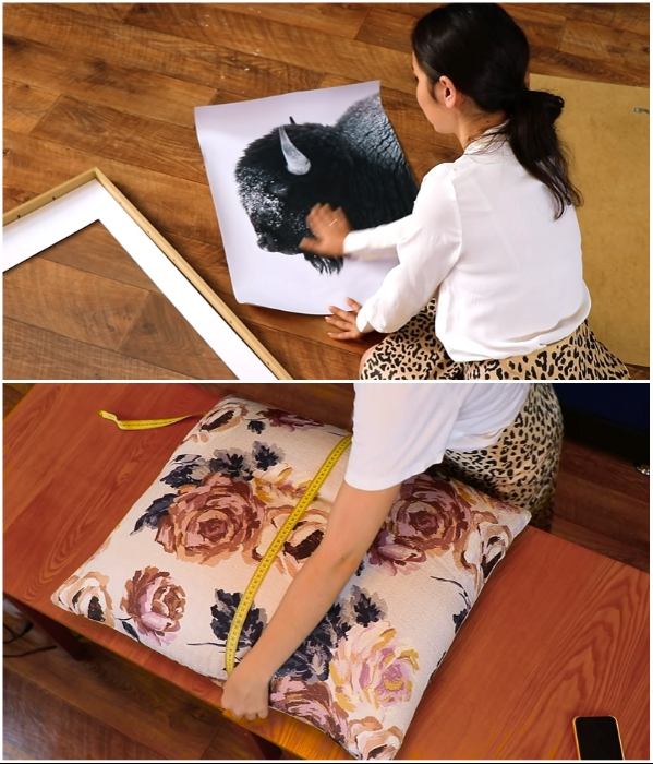 Несмотря на такое странное соседство, все элементы импровизированного декора выглядели довольно стильно и нестандартно. Дополнением к этому ансамблю стали плетеный горшок с большим цветком и яркие подушки, которые мастерица сделала собственноручно.