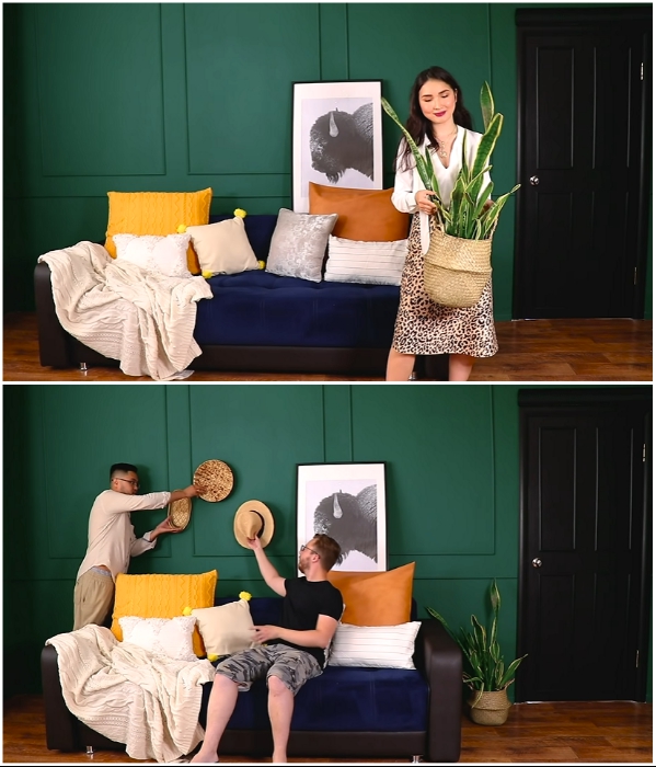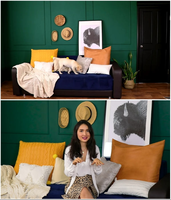 После того, когда все поверхности высохли и диван занял свое место, комната хоть и преобразилась, но выглядела совсем угрюмо из-за темных тонов краски. Чтобы избавиться от этого чувства, стоит продумать оригинальный декор как для самой стены, так и для дивана.