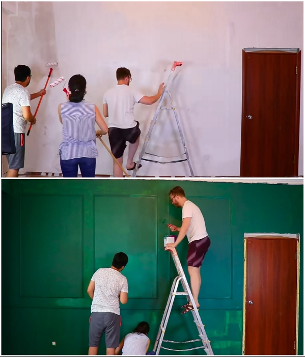Для своей работы ребята выбрали краску, имеющую уникальные свойства – керамик-барьер, именно они помогают предохранять поверхность от потертостей, сколов и повреждений. Это особенно важно в тех случаях, когда возле стены планируют устанавливать диван/кровать или устраивать рабочую зону.