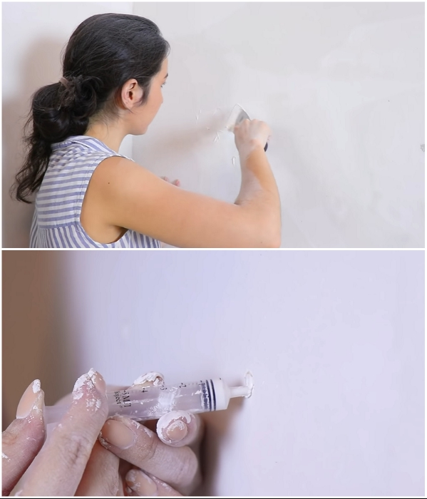 После того, как стены бы освобождены от старого материала, нужно обследовать поверхность. Если будут обнаружены повреждения в виде дыр от саморезов/гвоздей, отслоения побелки или штукатурки, трещин и т.д., их придется замазать шпаклевкой. После высыхания материала все застывшие образования нужно зашкурить с помощью наждачной бумаги. Также необходимо пройтись шлифовальной бумагой по всей поверхности стен, чтобы избавиться от явных неровностей. Это очень важно, особенно, если планируете создавать акцент с помощью интерьерной краски.