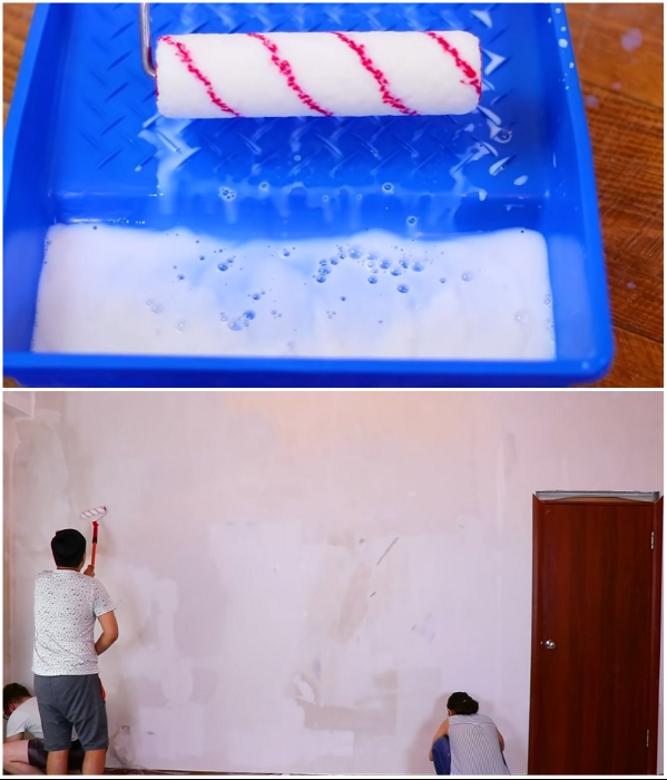 Когда закончена пыльная работа, можно приступать к грунтовке стен. Для этого лучше приобретать готовый раствор от проверенных производителей, потому что такие материалы помогут не только крепче держаться обоям/краске, но и будут предохранять покрытие стен от плесени/грибка и прочих неприятностей. Важно: Если до начала ремонтных работ не накрыли пол полиэтиленовой пленкой, нужно это сделать до нанесения жидкой грунтовки. Мало того, что в последствии будет меньше уборки, так и напольное покрытие не пострадает.