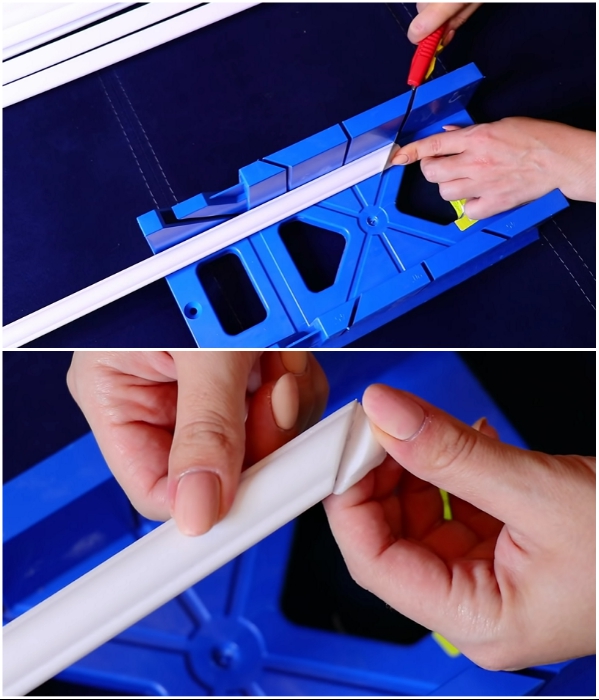 Совет: Никогда не приклеивайте подобного рода планки без разметки, сделанной с помощью уровня. Любой перекос испортит всю картину, впрочем, как и неаккуратный срез углов. Для того, чтобы на выходе получить идеально ровный угол под 45 или 90 градусов нужно воспользоваться стуслом и острым канцелярским ножом.