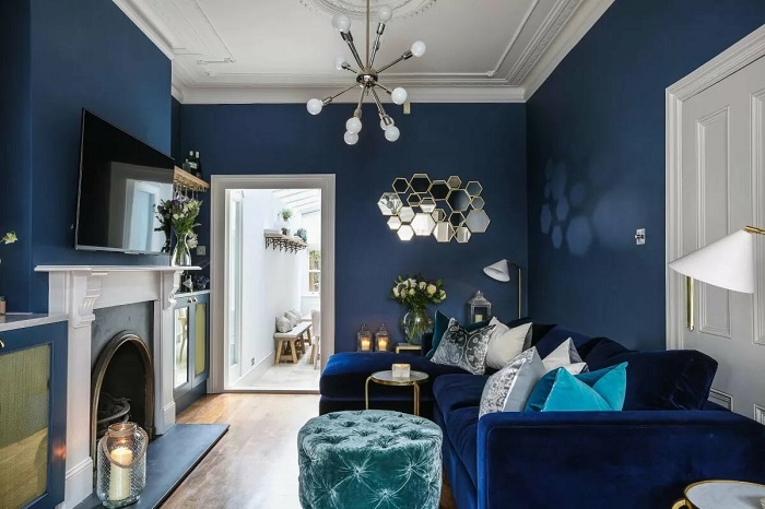 Интерьер гостиной в глубоких синих тонах. / Фото: deluxe.ru