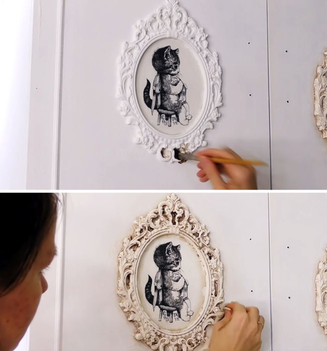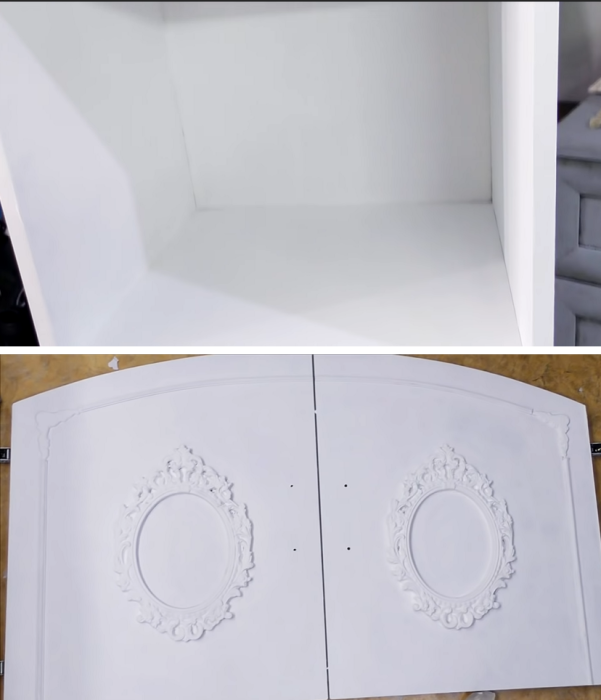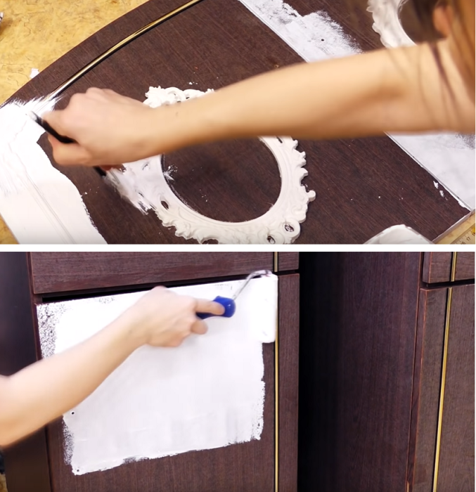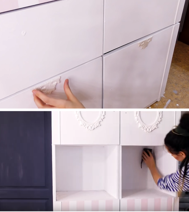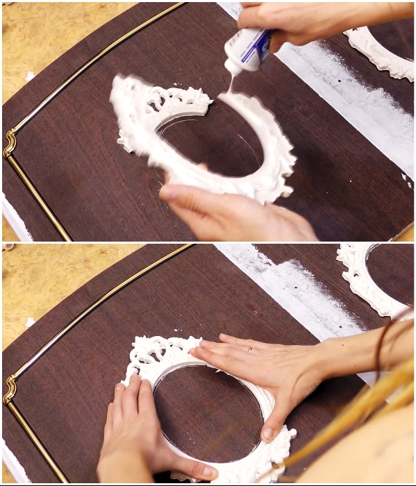 Те детали мебели, на которых планируется закрепление украшений в виде декоративных элементов, лучше снять с петель и положить на ровную поверхность стола. Клеить подготовленные рамочки/детали можно на «жидкие гвозди», которые походят для работы с гипсом. Излишки материала стоит убрать до полного высыхания. Это можно сделать с помощью деревянных шпажек/апельсиновых палочек.