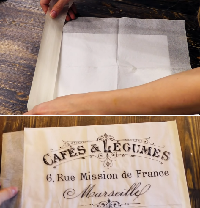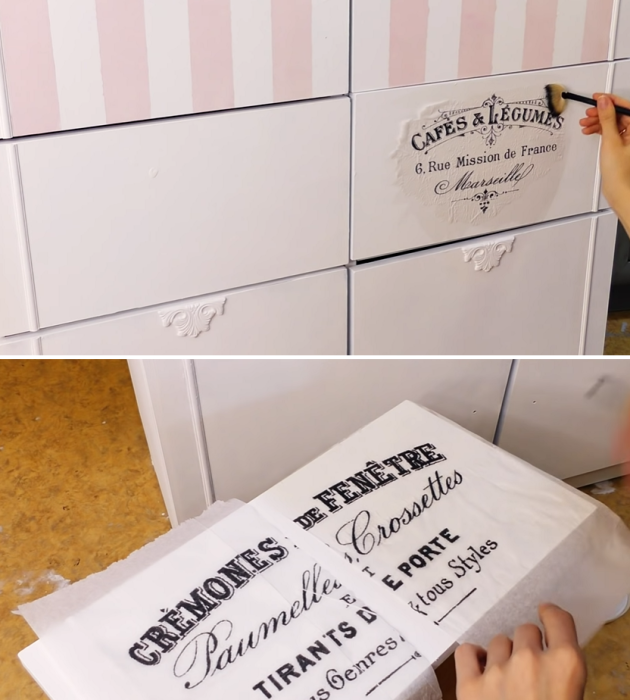 На этом преобразования не закончились, поскольку Елена решила в созданных из гипса рамочках и некоторых дверцах шкафа сделать интересный дизайн с использованием техники декупаж. Обычно основой для подобного украшения становится рисунок на бумажной салфетке или на тонкой ткани, но найти готовое изображение не всегда получается, поэтому изобретательный народ находит нужный рисунок/надпись в Сети, разделяет трехслойные салфетки и на белой части, с помощью лазерного принтера, его распечатывает. Полезно знать: Для того, чтобы во время печати на тонком материале не образовывались заломы, его нужно закрепить на офисной бумаге с помощью малярного скотча.