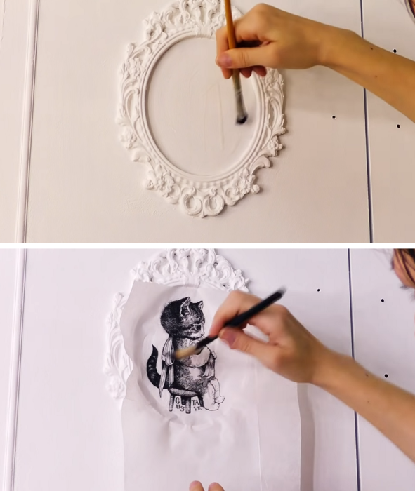 Для того, чтобы зафиксировать рисунки и надписи на поверхности мебели понадобится лишь клей ПВА, кисточка, выдержка и терпение. Для начала на выбранную площадь наносится плотным слоем клей, потом прикладывается рисунок и аккуратными движениями кисточки от центра изображения выгоняются пузырьки воздуха и разравниваются заломы.